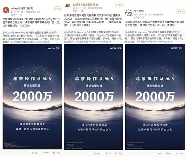 9 月 29 日,华为终端官方微博对外公布,HarmonyOS 5 终端数量历经两年发展已突破 2000 万,从 0 到 1000 万,鸿蒙 5 走了近 10 个月;而从 1000 万到 2000 万,仅用了 2 个月。这一数据不仅标志着鸿蒙生态迈入爆发式增长的新阶段,还将进一步强化伙伴信心,成为海内外应用厂商加速共创、促进鸿蒙生态持续繁荣的重要推动力。