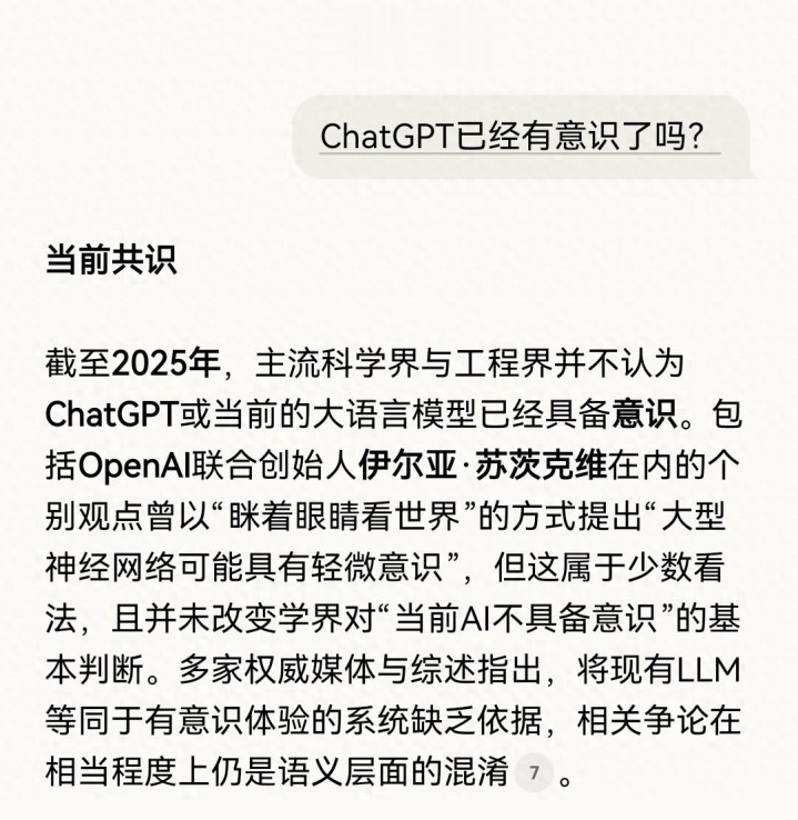风格越来越像马斯克和雷军了,ChatGPT真的会有意识吗?于是我去问了问ChatGPT和DeepSeek,它们给我的答案是这样的: